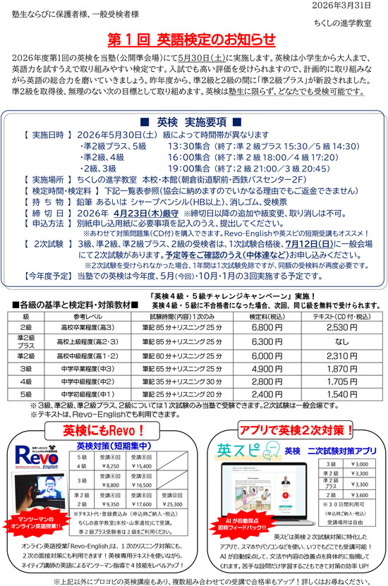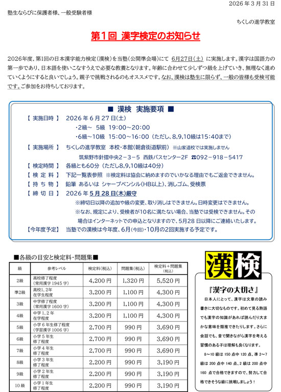 2026年度、第1回英検・漢検のご案内です。当塾は検定準会場の認定を受けております。対策テキストや英検リスニングCDも当塾で購入できます。塾生に限らず、どなたでも受検可能!毎回、地域のお子様から大人まで多数ご参加いただいてます。ご相談お申込みは随時ご連絡ください。