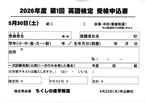 ≪英語検定≫ 当塾実施日:5月30日(土) テスト時間帯は級によって異なります。本校にて開催。申込受付開始しました。受付期間は4月23日まで。