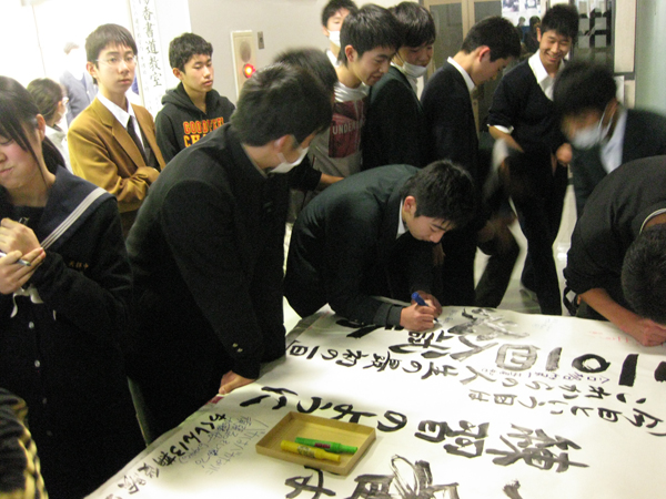 受験が近づくと次第に感じ始めるプレッシャー。先輩たちの話や今後の予定等の話を聞いて、志望校に対する強い気持ちをもつことができます。必勝絵馬は受験の日にもっていく生徒も多いようです。 最後は、卒業証書と卒業アルバムを贈呈。もうひとつの母校として、大切な「おもいで」にしてほしいという気持ちです。
