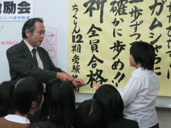 もうひとつ、合格を勝ち取るうえで大切な条件は、受験生自身のメンタル面の強化と生活習慣・学習習慣の改善です。習熟度別の集団授業であるからこそ、一人ひとりの違いや温度差がくっきりと浮かび上がってくると言えるかもしれません。面談や授業外の時間を活用して、個別の質問対応や声かけを行い、よりよい方向へと軌道修正していきます。「一人残らず合格!」、ちくしんは本気です。